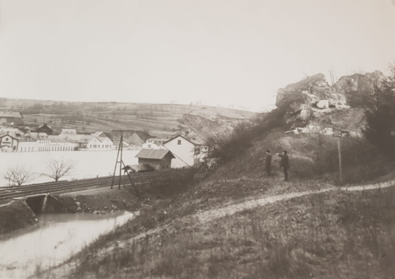 Haus und Werkstatt des Bildhauers Leonhard. Die Häuserzeile ganz rechts gehörten zur Marmorfabrik. Sie wurden abgerissen. Das Haus in der Mitte gehört heute Martin Scheu und das Gebäude links steht auch nicht mehr.