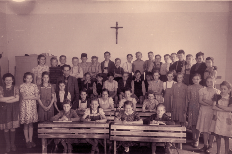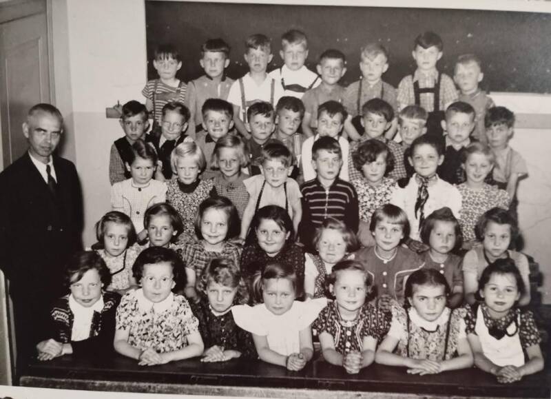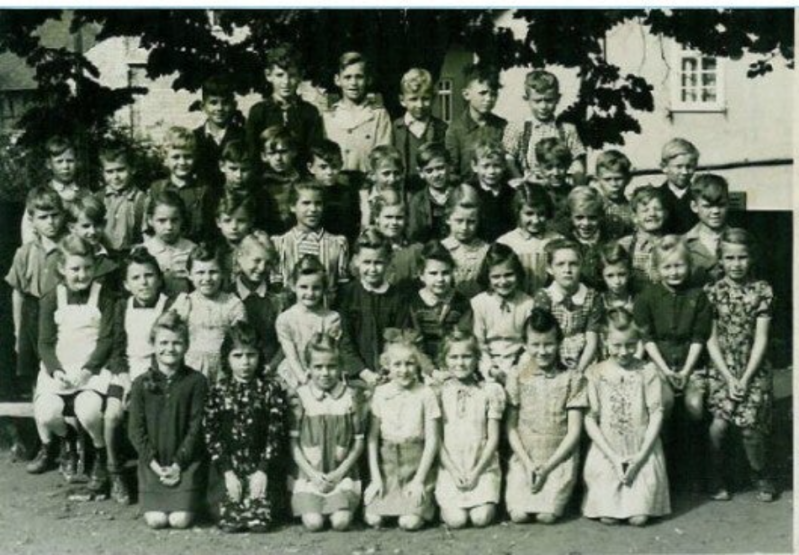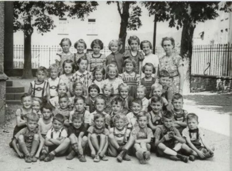 Jahrgang 1947/1948 mit Lehrerin Frau Hartmann. Die Jungs in Lederhosen, die Mädchen im Kleid.
