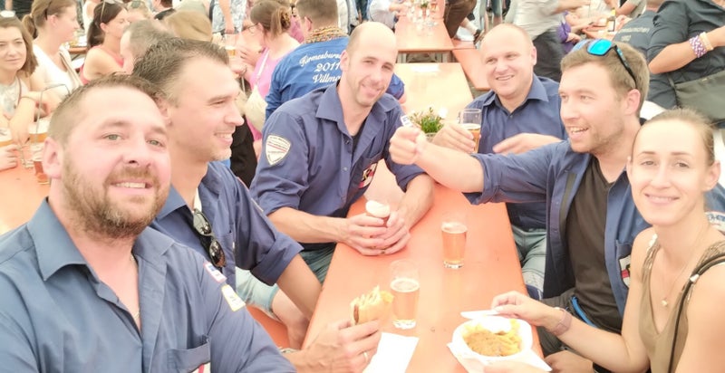 Von links (unten): Marcell Herold, Simon Fluck, Alexander Breuer, Vincent Schmidt, Ioannis Arampatzoglou (Kirmeswirt)